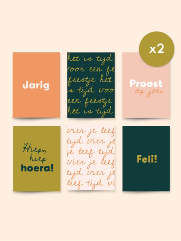Voor deze feestelijke set hebben wij gekozen voor zes verschillende ontwerpen. Allemaal in de huisstijlkleuren van Van de kaaart. De teksten op de kaarten zijn gedrukt met opdikkend hoogglans uv-lak voor een extra mooie uitstraling.